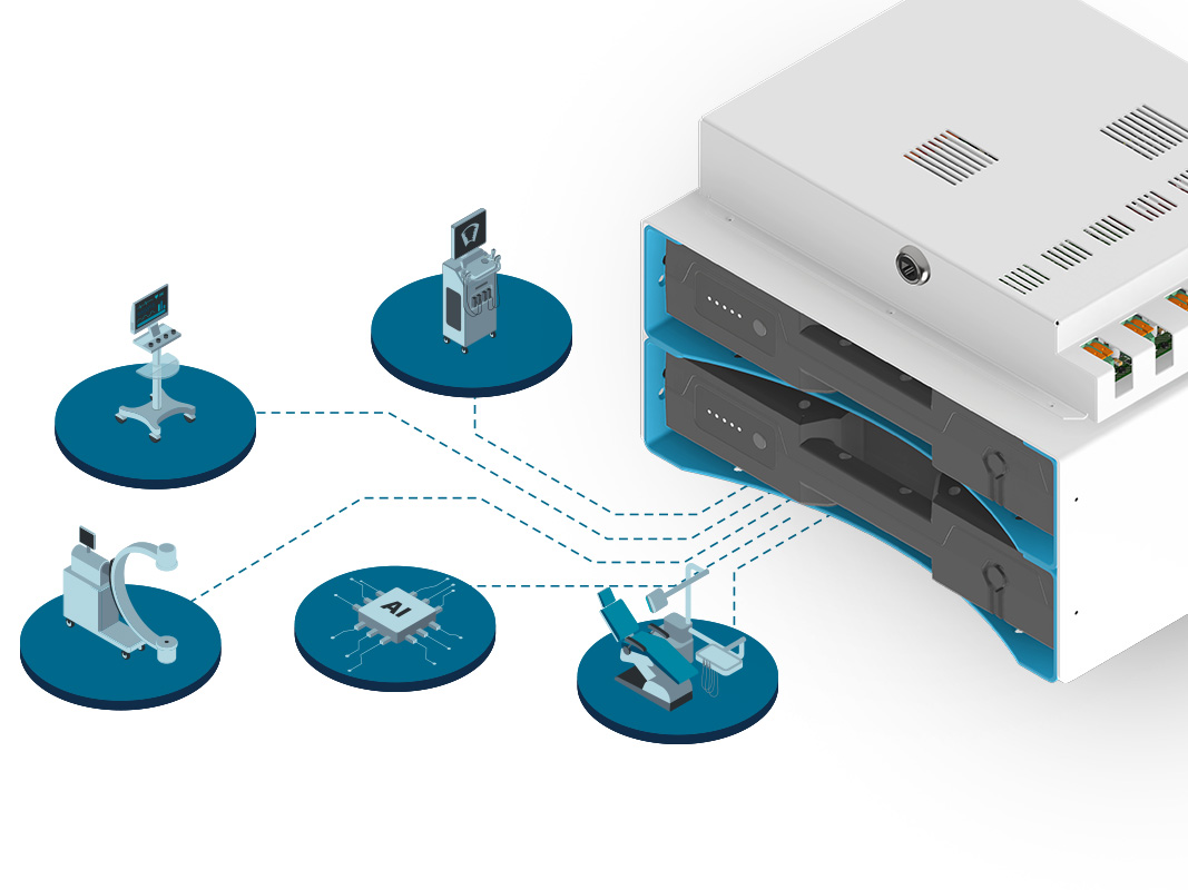 The medical power supply and distribution system MPSD 60-40 DC has been specifically developed for demanding applications in medical environments. It ensures a safe, flexible, efficient, and uninterrupted power supply – precisely where it is needed most. Whether in ambulances, mobile intensive care units, or field hospitals, the system reliably powers ventilators, monitoring systems, infusion pumps, and other critical medical devices at various supply voltages – simultaneously and without interruption.